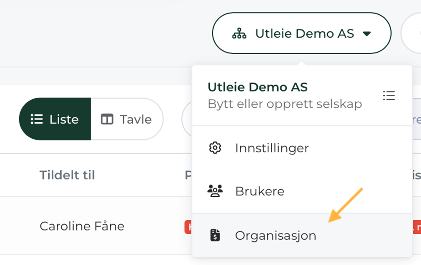 Porteføljevisningen finner du under "Organisasjon" under aktivt selskapsnavn.