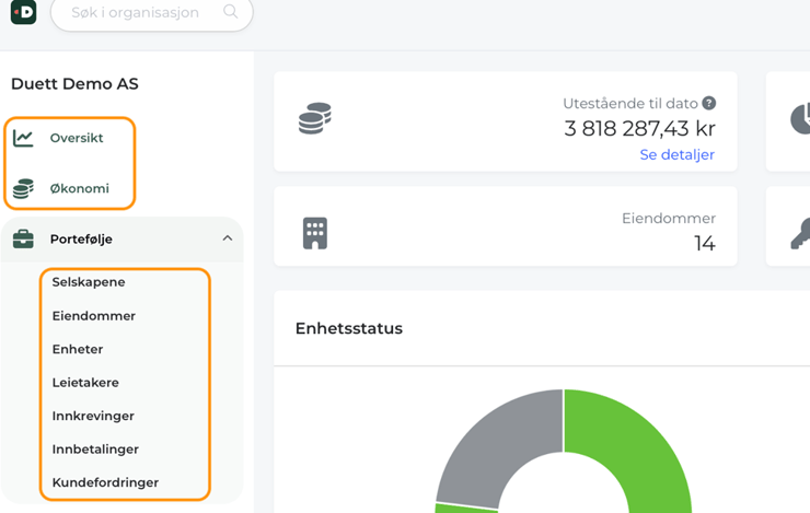 I menyen under porteføljen kan du navigere på tvers av alle selskaper, eiendommer, enheter, leietakere, innkrevinger, innbetalinger og kundefordringer.