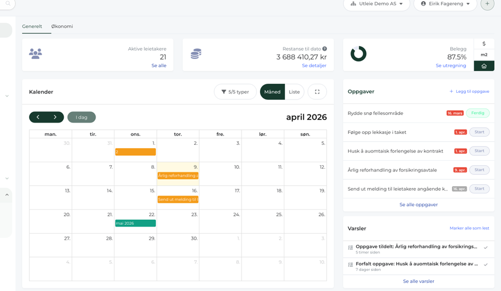 De nye oppgavene og varslene vises i en kalender på forsiden av Duett Eiendom.
